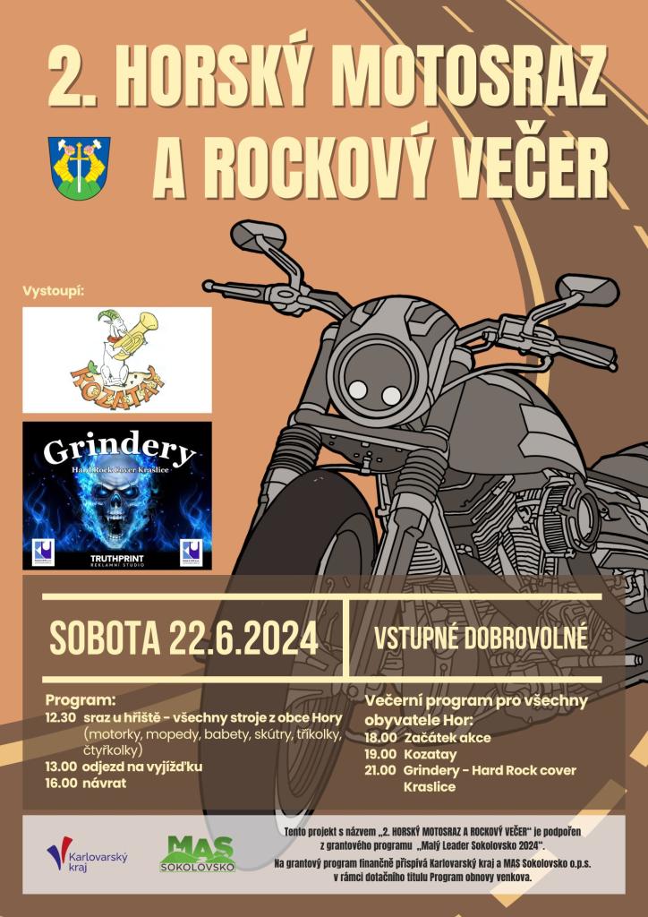 V sobotu 22. června 2024 od 13 h. proběhne horské setkání příznivců všech motocyklů. Od 18 h. se můžete těšit na zábavný večer plný muziky. V 19 h. vystoupí kapela Kozatay, ve 21 h. kapela Grindery - Hard Rock cover Kraslice.