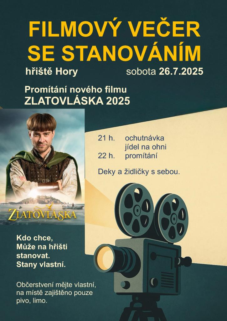 Na sobotu 26. července 2025 je naplánováno promítání nového filmu Zlatovláska, které začne v 22 hodin. Před filmem v 21 hodin se uskuteční ochutnávka jídel na ohni, takže si můžete vychutnat skvělou atmosféru. Pro účastníky je doporučeno vzít si deky a židličky, a ti, kteří mají zájem, mohou přespat na hřišti ve vlastních stanech. Na místě bude zajištěno pouze občerstvení v podobě piva a limonády. Ostatní občerstvení si vemte vlastní.